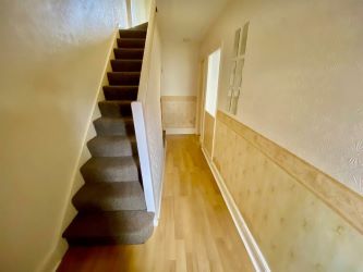 Entrance Hall - 4.57m’0.61m”×1.52m’1.22m” (15’2”×5’4”) - Upon entry, the property welcomes you through a UPVC stained glass front door, providing both aesthetic appeal and durability. The floor is adorned with timber laminate flooring, adding a touch of elegance. A staircase with laminate steps ascends to the first floor, granting access to the accommodation on the upper level. Additionally, from the entrance hall, there is an internal doorway leading to the dining room, promoting seamless connectivity within the property.