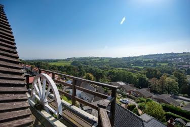 Lounge 6.49m x 5.77m max. 3x Double glazed windows. Doors to front and rear leading to circular balcony. 3x radiators. Living flame gas fire in feature surround. Built in storage. Exposed ceiling beams.