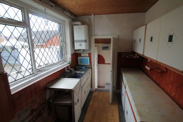 Kitchen - 8'8'' x 6'8''. Window to side. Wall mounted gas boiler. Wall and base units. Single drainer sink. Rear porch and rear door.