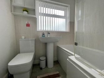 Fitted with three piece suite comprising of bath with shower over, pedestal hand wash basin, low level wc, frosted uPVC double glazed window to rear.