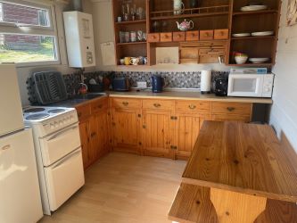 Kitchen - 10'5'' x 8'2''. Having a range of solid timber kitchen cupboards with worktop surfaces and tiled surround to include a stainless steel sink unit with gas fired water heater. Electric cooker point, wall mounted shelving, laminate floor. Double glazed window and door to rear.