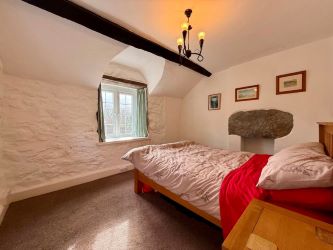 Window to front with open countryside and far distant mountain views, window to side overlooking the side garden, exposed beams, unused fireplace with exposed stone lintel, access to roof, radiator, carpet.