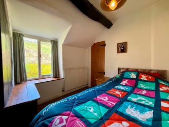 Window to front with open countryside and far distant mountain views, access to roof space, exposed beam, wall light, cast iron ornamental fireplace with slate hearth, radiator, carpet.