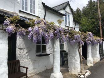 A stone pillared veranda, framed by a beautiful and established Wisteria plant, part slated and corrugated roof, seating area enjoying views across the country lane and distant countryside. Door leading into the workshop.