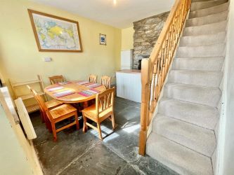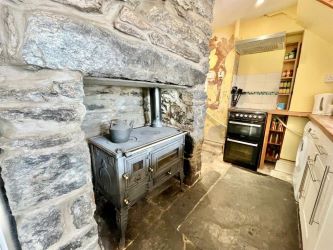 Kitchen/Dining Area - 13'2'' x 9'4''. UPVC double glazed front door with stairs leading off. Inglenook style solid fuel cooker with stone surround and slate lintel. Fitted range of base units with complimentary worktops, space and plumbing for automatic washing machine, electric hob with extractor canopy over, ceramic Belfast sink (no hot water connected to kitchen), decorative wall tiling, inset spot lighting, large slate flagged flooring, UPVC double glazed sash windows overlooking front elevation, wall mounted electric heater, cupboard housing electric units.