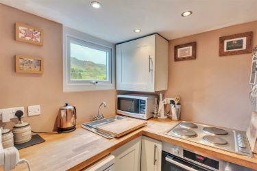 Kitchen - Fitted base and wall units with work surface area incorporating sink unit with mixer tap over and delightful views over Carrog through UPVC double glazed window above. Electric oven and hob, space for under counter fridge/freezer, spot lights to ceiling, slate floor.