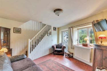 Lounge - 3.65m x 3.31m. Quarry tiled floor, far reaching views through UPVC double glazed window, multi fuel burner, tv point, radiator, under stairs cupboard and stairs off to first floor.