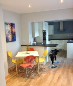 Kitchen/Diner - 3.69m x 2.62m. Modern kitchen comprising white fronted wall and base storage units with brushed steel handles. Work surfaces and tiled splashbacks. Built in ceramic hob with stainless steel extractor over, electric oven and integrated dishwasher. Stainless steel sink unit with mixer tap. Washing machine and free standing fridge freezer. Radiator, mains smoke alarm and four downlights. Tile effect laminate wood flooring. Window to rear elevation.