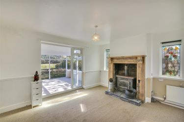 Lounge 3.63 x 4.11m - With two stained glass feature windows to the side either side of a stone inglenook fireplace with log burning stove and stone hearth, radiators and two sets of French doors through to conservatory.