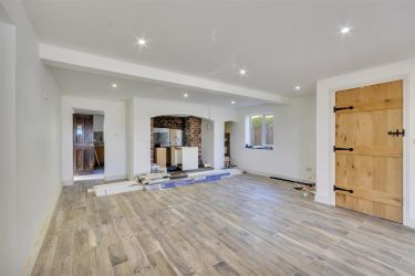 Secondary Kitchen 3.87 x 3.54m - The secondary kitchen has a window to the side, base units, tiled floor, an exposed brick fireplace and the shower room off.