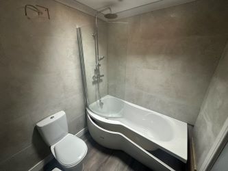 Comprising a P-shaped bath with shower over and glass shower screen, wash hand basin, WC and heated towel rail.