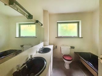 Family Bathroom - The bathroom has a panelled bath, a window to the side, low level w.c., radiator and double sinks on a vanity unit.