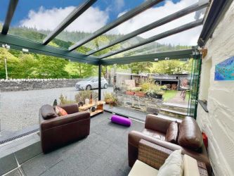 To the side of the property is a driveway leading to the, south facing, owner's accommodation with side and rear doors. To the rear of the property is a car park for 5 cars plus 3 outbuildings which are currently used for bike storage and as a workshop and one having a washing machine and tumble dryer . Directly outside the outbuildings is a private, raised owner's area and large log store. The current owners have added a Solarlux sunroom to take full advantage of the views to the rear of the property. This multi-use room can be used for dining, relaxation or as a yoga room or gym.
